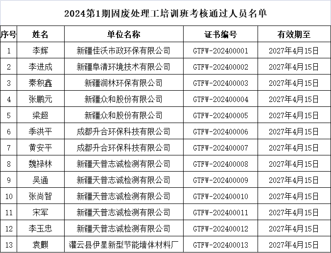 2024年第1期固體廢物處理設(shè)施運行人員培訓(xùn)班考核通過名單公布